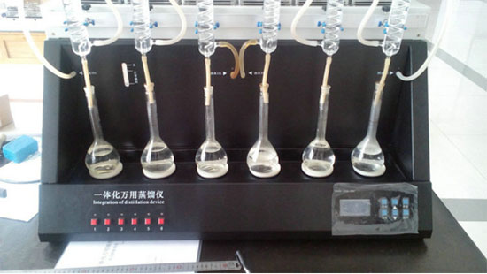 智能一體化蒸餾儀主要由加熱裝置、蒸餾裝置、循環(huán)冷卻水裝置和接收裝置四部分組成。加熱裝置設(shè)置了加熱速率智能控制功能,可實現(xiàn)加熱溫度和加熱效率精密控制;蒸餾裝置為專利性設(shè)計,蒸餾效率高、冷凝效果好;循環(huán)冷卻裝置設(shè)置了冷卻溫度顯示和控制功能,可確保冷卻效果。接收裝置設(shè)置了蒸餾終點檢測和自動停止加熱功能,實現(xiàn)了智能加熱控制。
